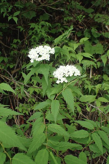 | 山地の岩場や斜面などに生える落葉低木で、高さは1メートルほど。葉は互生し、卵形で、先は尾状に尖り、縁には重鋸歯がある。 花は直径5センチほどの散房花序となり、小さな白い花を沢山付ける。花弁は5枚で、直径6ミリほど、多数の雄しべは花から突き出る。花期は6〜7月。北海道、本州北部に分布する。 〜徒然想〜 エゾの地には、本種の仲間がいくつかあります。エゾシモツケ(山地岩場、湿地)、マルバシモツケ(亜高山帯)、エゾノマルバシモツケ(高山帯)、その他変種や品種などです。それぞれ、棲み分けがあるようです。 本種についていえば、撮影地は山地の林の中、海岸から少し川を遡った林の中でした。 特徴としては、葉が尾状に尖る、花序は半球形にならない(多くは花序が半球形になる)などが挙げられます。 遠い地の訪問では、前に見た花と思って撮影しないと、あとで後悔することがあります。観察する目が大事です。 本種での気付きは、葉の形でした。 −同じ科の植物− |
