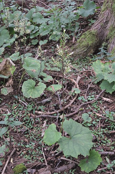 静岡県伊豆半島に特産する。山地の林下などに生える多年草で、高さは40〜60センチ。葉は普通2枚、長い葉柄があり腎形、歯牙縁で、その縁に細かい微鋸歯がある。葉の基部は深い心形。 頭花は総状円錐花序に多数付き、小花は4〜5個、白色で長さ11ミリほど。総苞片は5個。花期は9〜10月。 〜徒然想〜 カニコウモリの葉はふつう3枚であるのに対し、イズカニコウモリは葉が2枚です。葉が大きく、丸みがあるようです。 そんな特徴を頭において、何度か伊豆に足を運びましたがみつかりませんでした。 カニコウモリは亜高山帯でふつうに見られるので、イズカニコウモリも同様だろうと安直に考えていたいました。 この植物を探すことを主目的に山に入った訳ではないのですが、みつかるはず(と勝手に思っていた)のものがみつからなかったのは、何とも悔しい想いでした。 ようやく情報を得て、今度はこの植物を主目的に山に入ります。大群生です。これほどの群生が見られるのなら、各所に散っていてもいいと思うのですが、この植物の産地は思っていたよりも低地で、偏りがあるようです。 −同じ科の植物− |