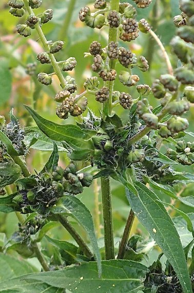 北アメリカ原産の帰化植物。河川敷、荒地などに生える1年草で、高さは2〜3メートルになる。茎は毛が多く、よく分枝する。葉は対生し、掌状に3〜5中裂する。 頭花は単性で、雄頭花と雌性花があり、雄頭花の総苞片は合着して傘形になり、中に両性の筒状花が入っている。花期は8〜9月。 〜徒然想〜 目のかゆみや鼻水症状などを伴う鼻炎、特に春先のスギ花粉による花粉症は、多くの日本人の悩みとなっています。 花粉などの外からの刺激に対するアレルギー反応が原因なのですが、引き金となる花粉はスギだけではなく、ヨモギやブタクサも原因になります。 オオブタクサも同様です。これらの植物の花期は夏から秋ですので、花粉症の方は長い期間鼻炎症状に悩むことになります。 お大事に!といいたいです。 別名はクワモドキ。桑に似た大きな葉を持っています。 −同じ科の植物− |