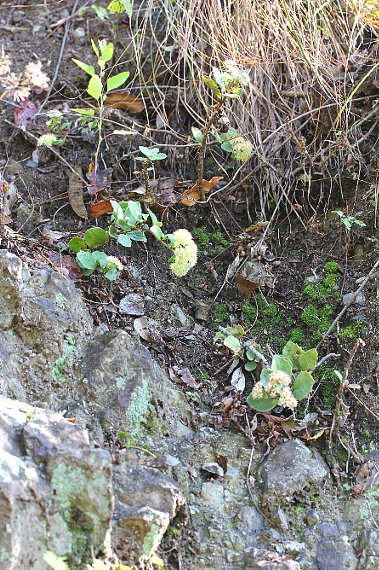 | 山地の岩場などに生える多年草で、高さは15〜40センチ。茎は汚赤褐色で斜上する。葉は互生、稀に対生し、卵円形、縁に鈍い鋸歯がある。 花は茎先の散形花序に多数密に付け、淡黄緑色で5弁、葯は赤色。花期は9〜11月。茨城県、福島県の一部に分布する。 〜徒然想〜 チチッパベンケイの変種で、植物体に乳頭状突起が密生する点で違いがあるとされています。 しかし、観察しても乳頭状突起がどんなものかよく分かりませんでした。花茎に茶褐色の突起らしきものがある個体が見られ(全ての個体ではない)、これがそうなのかな、と思える程度でした。 疑問を持ったままの帰路となってしまいましたが、この地のものはオオチチッパベンケイとされていますので、それに従いました。長野県や群馬県に自生地があるとされるチチッパベンケイとも比較しないといけないですね。 オオチチッパベンケイは、茨城県レッドデータブックでは危急種に、環境省レッドデータブックでは絶滅危惧種IB類(EN)に分類されています。盗掘が絶えず、育成、移植、啓蒙などによる保護活動が継続されています。 −同じ科の植物− |
