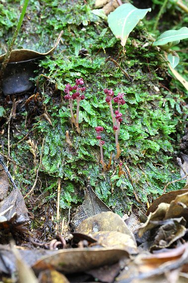 暗い林内の落葉や朽木の間などに生える腐生植物で、高さは6〜10センチ。全体に紫褐色〜紅紫色で、葉は鱗片状で卵形、茎を囲む。 花は茎の先に総状花序となり、数個〜20個ほどの花を付ける。上部に雄花、下部に雌花がつく。雄花の花被は紫褐色で6裂し、裂片は細い線形で尖る。雌花の花被片は集合果を作る。花期は7〜9月。中部地方以南〜沖縄、小笠原に分布する。 〜徒然想〜 この植物もタヌキノショクダイと同様に超レア品で、なかなか見ることはできません。というよりも、こちらの方は暗い場所に生え、小さく、全草が紫褐色なので、不案内な場所ではなかなかみつけることができないと言った方がいいかもしれません。 現地の女性連に案内して頂き、“ここにありますよ!”、と教えられても、見えないほどです。 この場所で最初にみつけた方には、本当に敬意を払いたいです。 カメラのモニターを拡大して、やっと花の形が見えてきました。まだ咲き始めのようです。雄花が数花開いているのが見えます。下方の塊は雌花でしょう。 それにしても、今のカメラはすばらしい。肉眼ではほとんど確認できないほどの花が、明るく写っています。 −同じ科の植物− |
