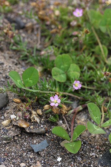 | ヨーロッパ原産の帰化植物。海岸の湿った砂地、空き地、道端などに生える1〜2年草で、高さは5〜30センチ。よく分枝し、地表をのびる。葉は対生し、線形でやや多肉質。基部に白色の托葉がある。 花は淡紅色で、直径7ミリほど。花弁は5枚で萼片より少し短い。花期は4〜10月。 〜徒然想〜 北海道の海岸の花観察は、なかなか楽しい。これはといったところに随時車を停め散策すると、必ずといっていいほど目新しい花が現れます。 この花も海岸砂地の各所でみられました。 花が白い似た花もありました。こちらはウシオツメクサを疑いましたが、本州の海岸でもよく見られるハマツメクサのようでした。 それにしてもウスベニツメクサは、帰化種とは思えないほど、その薄紅色が可愛い。 −同じ科の植物− |