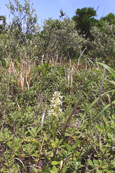 | 日当たりのいい草原などに生える多年草で、高さは20〜45センチ。葉は茎の下部から1〜3枚出て斜上し、長楕円形。 花は淡緑色を帯びた白色で多数付ける。鱗片葉が付くことや唇弁の距が長いのが特徴。花期は4〜5月。東京都伊豆七島に特産する。 〜徒然想〜 前年、同行者はこの花を探してこの島を訪れたが、みつからなかったという。今回は新たな情報を得て、生息地を絞ります。 1個所目は不発・・・・・・みつかりませんでした。いい環境と思われただけに落胆が大きいです。気を取り直して移動しますが、当てがあるわけではなく気がやや重いドライブになりました。 そして・・・、今から思うと、何か導きがあったとしか思えません。辿り着いたその場所には、新たな情報と一致する理想的な空間が広がっていました。 確信の下に探し始めてまもなく、同行者の声が上がります。ありました〜!いつになく、同行者の声が上ずっているように聞こえます。 白い花が、ほんとに綺麗です。青空を背景に、愛しむように撮影しました。 −同じ科の植物− |