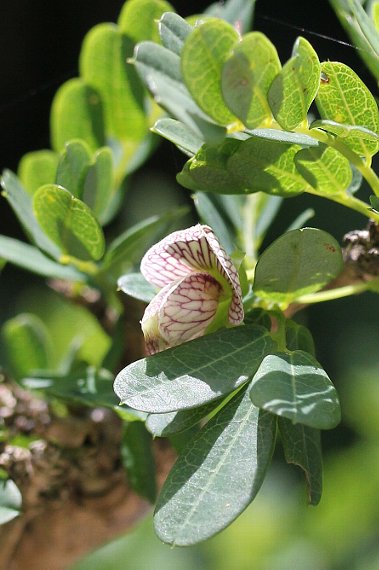 海岸の林縁などに生える小高木で、高さは6メートルほどになる。葉は奇数羽状複葉で、小葉は12〜16個、長楕円形〜狭倒卵形、先は円頭又は鈍頭、やや光沢がある。 花は葉腋に総状花序又は束生状に2〜6個付き、蝶形、淡黄色で紫褐色の脈が特徴的である。節果は長さ10センチほどで、5〜8個の小節果からなる。花期は6〜9月。奄美諸島〜沖縄県に分布する。 〜徒然想〜 船が出るまでには5分ほど間がありそうです。仲間が見つけたこの花を急ぎ撮ります。 マメ科でこんな色や筋が入る花は珍しく、じっくり観察したいところですがそうはいきません。足元も危ない状況です。そんな撮影でも、何とかピンボケもなく撮れていました。 改めて画像を見ると、なかなか上品な花姿です。紫色の筋もきれいです。 これはもう一度出逢う価値がありそうです。 −同じ科の植物− |