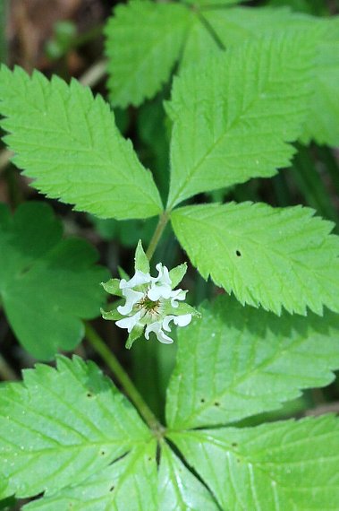 | 山地〜亜高山帯の林内、林縁などに生える草本状の落葉小低木で、高さは10〜30センチ。つる状の茎が地表を這い、所々で花茎を立てる。全体に刺がない。葉は5出複葉で、小葉は菱状卵形で、縁には欠刻と鋸歯がある。 花は1個ずつ上を向いて咲き、花弁は白色で7枚、長さ8ミリほど、全開しない。萼裂片は7個で、平開する。果実は集合果で、赤く熟す。花期は6〜8月。本州中部地方以北〜北海道に分布する。 〜徒然想〜 足元に小さな白い花が見えました。明らかにイチゴの仲間です。花は小さく1センチにも満たず、花弁が皆立ち上がっています。 名前が分からないので、後で調べることにして撮影しておくことにしました。 名前はヒメゴヨウイチゴでした。ゴヨウイチゴとは、全体に刺がないこと、花が上を向いて咲く違いがあり、トゲナシゴヨウイチゴの別名があります。 南アルプスの北岳などでも見られるようですが、花期に北岳を歩いたこともあるものの見たことはありませんでした。 −同じ科の植物− |