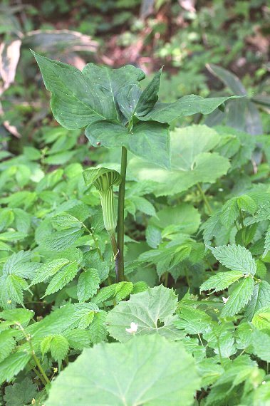山地の林下などに生える多年草で、高さは15〜70センチ。葉は1個、小葉は5〜7枚で、卵状楕円形〜倒卵形で、先は鋭頭、全縁。花は葉よりも下に付く。 仏炎苞は緑色又は紫褐色で、著しく隆起する隆起する白条がある。付属体は棒状、ときに太い棒状頭状。花期は5〜6月。北海道、本州の主に日本海側、九州北部に分布する。 〜徒然想〜 稀少なイナヒロハテンナンショウを探し出そうと一念発起し、何とか探し出すことができました。では、母種(後に別種と判定された)のヒロハテンナンショウは・・・?ということで、撮り終えた画像を探してみました。 不明種としていたものの中に・・・ありました。新潟で撮影していました。 カミコウチテンナンショウを探した地(長野県)では、多くの本種がみつかりました。今度は、すぐに本種と同定することができたつもりでしたが、この仲間は調べれば調べるほど難しいグループであることが分かってきました。 例えば、アシウテンナンショウは本種とは区別できないとされましたので、アシウテンナンショウとして収載していた画像を、本項に移動しました。 この分野は難しいです。精進が必要です。 −同じ科の植物− |