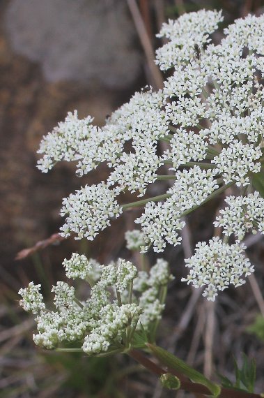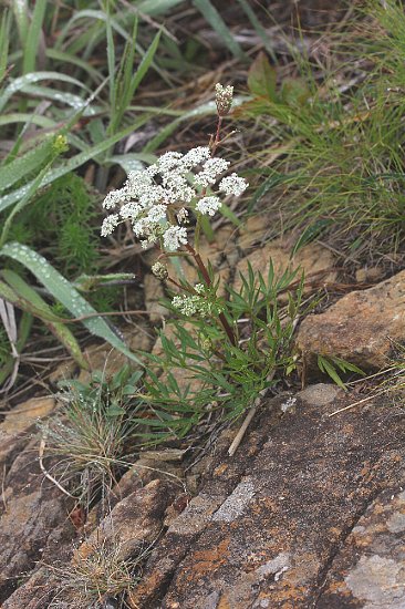 | 高山帯の蛇紋岩地に生える多年草で、高さは20〜50センチ。茎は紫色を帯びる。葉は3回3出羽状複葉で、葉柄の基部は鞘状になる。小葉は線形で先が尖り、質は硬く、光沢がある。 花は枝先に複散形花序となり、白色で小さな花を多数付ける。小総苞片は糸状。花期は7〜8月。北海道夕張、日高山地に分布する。 〜徒然想〜 今回のアポイ岳訪問にあたって出逢いを楽しみにしていた植物の一つです。蛇紋岩地に固有な植物ということが、そんな想いにさせたのでしょう。 稜線に出ると、楽しみにしていた花が次々と見られるようになってきました。アポイマンテマ、アポイハハコ、アポイアザミ等々・・・。ホソバトウキも、最初にみつけたのは蕾で花期には早かったかと一時はがっかりしましたが、次第に盛期の花を付けているものが見られるようになってきてホッとしたものです。 蛇紋岩の岩肌を背景に固有の花を撮る〜現地に来なければできない幸せです。 −同じ科の植物− |