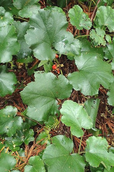 | 山地の林下、林縁などに生える半つる性常緑小低木。茎は太く、針状の刺が疎らに生える。葉は広卵形で厚くて硬く、長さ20センチほどになることがある。時に3裂することがあり、先は円頭で、縁には浅い欠刻と鋸歯がある。 花は葉腋に1〜2個付き、直径3〜4センチ、花弁は白色で5個、縁は波打つ。果実は球形で、直径2センチほど、赤熟する。花期は3〜5月。中部地方以西〜沖縄県に分布する。 〜徒然想〜 目的地に向かう林道脇に大きな葉を持つキイチゴの仲間があるのに気付きました。ホウロクイチゴです。 葉は直径20センチほどもあり、今まで見たこともない大きさです。茎はがっしりとし、特に若い茎には毛がびっしりと生えています。葉は厚くごわごわした感じで、葉裏は軟毛があり白く、脈上には棘があります。一度見たら忘れられないでしょう。 もう10月末ですから、花は無く赤い実が残っています。食べられるようですが、手が出ませんでした。 花は無くても、十分にこの植物を堪能した想いです。 屋久島で花を見ることができました。 −同じ科の植物− |