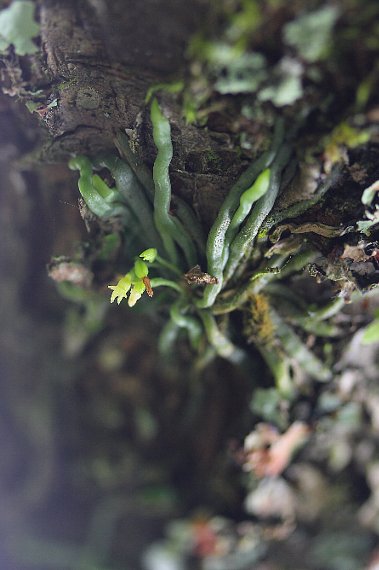 樹幹に着生する多年草で、茎は極短く、葉のように見える根を樹幹に伸ばし着生する。花は1センチに満たない花茎を出し、その先に淡緑色で長さ2ミリほどの花を1〜5個付ける。花期は6〜7月。本州福島県〜沖縄県に分布する。 〜徒然想〜 葉が無く、葉緑素を持った根で光合成を行う、変わった植物です。根は放射状に樹幹に貼り付き、蜘蛛が足を伸ばしたように見えることからこの名があります。 そんな変わった植物をいつかは見たいと思いつつ年を重ねるばかりでしたが、ようやくその機会が来たようです。梅の古木が並び、そのどの枝にも小さなこの植物が付いていました。花はほとんどが終わっていたものの、残っている花をみつけると歓喜しました。 花は、図鑑では2ミリほどと記載されていますが、4ミリほどの長さはあったように思います。それでも小さいことには変わりなく、撮影には苦労しました。唇弁らしきものも見えますが、不十分です。 次年は小さい花を撮る工夫をして、花弁の中を覗きたいと思っています。 クモランは、小さいし、全体に淡く色の濃淡がないので、撮りにくい花の一つです。 |
