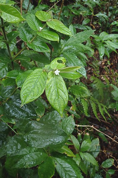 | 山地の樹林内などに生える常緑低木で、高さは1メートルほど。葉は対生し、長楕円形〜楕円形で、先は短く尖り、基部は円形〜浅い心形。葉柄はないかあっても短い。托葉は狭三角形で先が尖り、長さ4ミリほど、剛毛が密に生える。 花は葉腋に1〜3個つき、花冠は白色漏斗形で長さ7ミリほど、先は5裂する。果実は液果で球形、直径7ミリほど、瑠璃色に熟す。花期は12〜4月。九州〜沖縄県に分布する。 〜徒然想〜 同行する花仲間は、こんな木の花には興味がないのか、花があるよと指摘しても見向きもしません。 ルリミノキの仲間ですが、以前見たリュウキュウルリミノキとは雰囲気が大分違います。葉が丸く、毛深い茎を持っています。花も毛深いです。 初めて見る花だと分かり、数ショット撮影しておくことにしました。 気が付けば、仲間の姿はすっかり見えなくなっています。一本道ですから、安心して後を追います。 −同じ科の植物− |