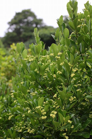 | 海岸近くの林内や林縁などに生える常緑低木で、高さは2〜6メートル。葉は対生し(まれに互生)、楕円形、縁には浅い鋸歯がある。質は厚く、両面無毛。 葉腋から集散花序を出し、黄緑色〜黄白色の4弁花を7〜15個付ける。花期は6〜7月。北海道南部〜沖縄県に分布する。 〜徒然想〜 初めて訪れる島の花観察は見るもの皆珍しく、今日一日で見た花の余韻を楽しみながら、のんびり歩きます。夕食前の花散歩です。 宿から山に向かう林道沿いは見知らぬ樹木が生え、その中で盛期の花を咲かせていたのが、本種とオオムラサキシキブでした。 遠くに海を望み、反対側には山がそびえる緩やかな登り道です。 梅雨時にもかかわらず、風は爽やかです。この島に梅雨はないのでしょう。 −同じ科の植物− |