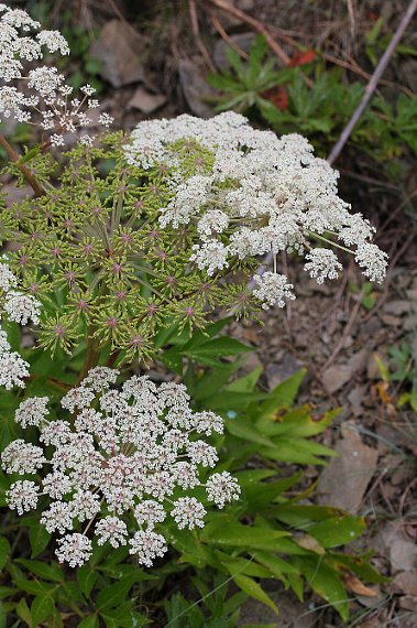 | 低山〜亜高山帯の岩上や草地などに生える多年草で、高さは20〜50センチ。トウキの高山型で、トウキより葉の幅が広い。葉は2回3出複葉で、表面に光沢がある。葉柄は鞘状に膨らみ基部は茎を抱く。 枝の先の複散形花序に多数の花を付ける。花は白色で5弁、直径3ミリほど。総芭片葉は普通0〜1個、小総芭片は数個ある。花期は7〜8月。本州滋賀県以北〜北海道に分布する。 〜徒然想〜 セリ科の見分けは難しく、未だに未同定種としてお蔵入りになっている画像が多くあります。しかし、セリ科の植物に接する機会が増えると、徐々にでも分かるようになってきます。 本種は、比較的背丈が低く(50センチほど)、光沢のある葉を持つので、比較的見分けがし易いかもしれません。 八方尾根など、よく知られた花の観察地での報告があることも、同定の手助けになります。 北海道では、海岸の岩場に生えていました。本州では亜高山に生える植物が海岸に生えるとは〜さすがに北の地です。 ただ、画像を図鑑等と比べてみると葉幅がホソバトウキと中間的なものも見られました。 −同じ科の植物− |