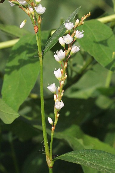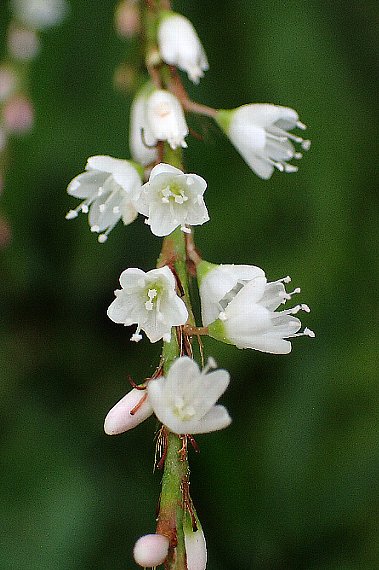| 湿地や水辺などに生える多年草で、高さは50〜100センチ。茎は直立し、よく分枝する。葉は互生し、披針形。鞘状の托葉は長い筒形で、伏毛があり、縁に長い毛がある。 枝先にややまばらな穂状の総状花序を出し、花を多数付け、先は垂れ下がる。花被は白色で5深裂し、長さ3〜4ミリ。従前は雌雄異株とされていましたが、近年では花柱や花糸の長さが異なる異形花柱であるとされています。花期は8〜11月。日本全土に分布する。 〜徒然想〜 サクラタデの白花品ではなく、別の品種です。サクラタデとは、花が白いこと、花被の長さが短いことなどが異なります。 日本全土で比較的容易にみられるようですが、皮肉にも出逢いは東京から遠く離れた宮崎県でした。 近くに川が流れる道端です。緑の草が生い茂り、その中で白い花がよく目立っていました。 いつかは見られると思っていましたが、遠い地での偶然の出逢いはうれしかった。 −同じ科の植物− |