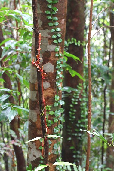 | 常緑樹林内などに生えるつる性の腐生ランで、長さ5〜20メートルになる。茎は樹幹をよじ登り、赤褐色。 花は茎頂に複総状花序になり、多くの花を付ける。花は淡黄色〜淡黄褐色で、唇弁は倒卵形で先は浅く3裂し、基部は筒状に巻き、唇弁中央には長い毛が密生する。果実は根棒状で、長さ10〜30センチ。花期は5〜6月。種子島以南〜沖縄県に分布する。 〜徒然想〜 別名ツルツチアケビ。 沖縄で何度か見かけたことがありますが、なかなか花には縁がなかった植物です。 3週間前に同じ場所で蕾の状態を見ており、今度は確実に花が見られるはずです。逸る気持ちを抑えながら、森の奥に向かいます。 ありました。花が咲いてます。ようやく出逢えた花です。 高ぶる気持ちのままに、撮影を続けたようです。あとで画像をみると、まだ十分に開花はしていないようです。あと数日〜1週間後がベストだったでしょうか。 この植物は、花が終わるとその枝は枯れてしまいます。左下の画像は、枯れた枝と新たに出た枝でしょうか。 -同じ科の植物- |