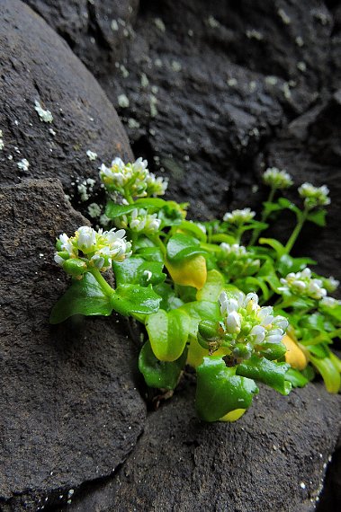 海岸の岩壁などに生える多年草で、高さは5〜30センチ。茎は地を這うか、基部で分枝して立ち上がる。根出葉は長い柄があり、腎形〜卵形で多肉質。茎葉は柄がなく、楕円形〜卵形で縁に少数の鈍鋸歯があ。葉は無毛で光沢がある。 花は白色、花弁は4枚で広楕円形、長さ3ミリほど。花期は6〜7月。北海道道東・知床半島に分布する。 〜徒然想〜 北海道道東に特産と思っていましたが、知床方面にも分布があるようです。稀少なキヨシソウと比べると数は多く見られるようですが、それでも稀少種には違いなく、岩の隙間や切り立つ岸壁で白い花をみつけ、喜び勇んで撮影しました。 でも、そこに落とし穴が・・・・・・。トモシリソウと思って撮影していたものの大半は、エゾイヌナズナでした。望遠レンズでしか撮影できない上方に生えていたこともありますが、岸壁の白い花に舞い上がり確認をおろそかにしたことが原因です。 それにしても、この岸壁は面白い。チシマキンバイ、ネムロシオガマ、ユキワリコザクラなど・・・、そしてキヨシソウも見られました。 翌年は小さな出逢いがありました。同好の方らしい撮影姿に話しかけると、「トモシリソウはこの先に行くと沢山ありますよ。そこに見られるのはリシリスゲですよ。ご存知ですか。」、と教えていただきました。 ん! と目を向けている間に、その方は撮影を終えて去って行きました。 もう少し話をしたかったのに、残念でした。 -同じ科の植物- |