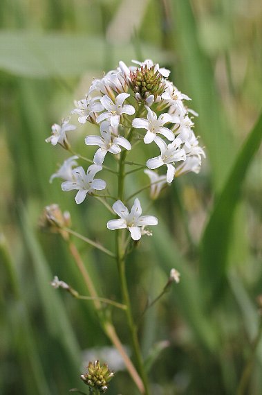 | 田や湿地などに生える多年草で、高さは10〜50センチ。葉はへら形〜倒披心形。 花は総状花序に白色の花を多数付ける。花弁は5裂し、先は尖る。葯は黄色。花期は4〜5月。愛知県と栃木県に隔離分布する。 〜徒然想〜 この花の名は古くから知っていましたが、愛知県はいかにも遠くずっと躊躇していました。自生地も、今一はっきりしません。 そんな中、花仲間のHPに栃木県での撮影画像が紹介されたのです。栃木県ならばと情報を収集し、生えていそうな環境を求めて現地に向かいます。 ここで幸運がありました。畑の整備をしていた方にトウサワトラノオのことを尋ねたら、知っていたのです。しかも、すぐそばまで来ていたのです。自分の探索力に自画自賛です。 自生地はよく整備されていました。関係者の保護の賜物です。土手下一面に白い花が広がっています。1株だけを撮るのが難しいほど、びっしりと群生しています。 撮影していると、土手の上から声がかかります。心温まる挨拶です。 −同じ科の植物− |