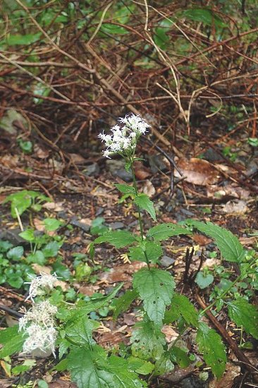 サケバヒヨドリは典型的なものは見られませんでしたが、ヤマヒヨドリはその特徴を示すものを見ることができました。葉が卵円形で幅広く、葉柄が特に下部の葉で明確にあります。背丈は30〜40センチほどで、立ち上がっています。登山道脇の草地で、やや暗い環境です。