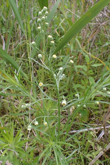 全体に白粉を帯びた感じで、上の方で枝を分け先に花を付けています。また、花は開ききっていません。というよりも、舌状花がごく短いのでこれ以上開かないのかもしれません。