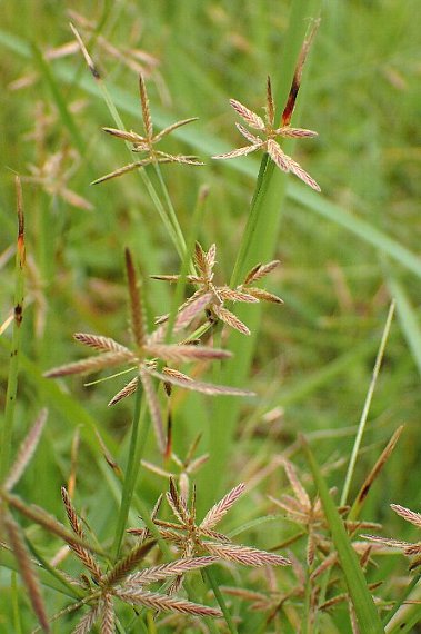 茎の先に花序よりはるかに長い葉状の苞葉を2〜4個付け、その間から3〜5個の花序枝を出し、先端に開出する小穂を5〜10個付ける。小穂は線形〜線状披針形、長さ1〜2.5センチ、扁平、暗褐色〜暗紫褐色で光沢があり、14〜50個の小花が2列に並んで付く。鱗片は狭卵形〜卵状楕円形、長さ1.5〜2ミリ。鈍頭〜円頭、中肋は緑色で縁は濃紫褐色。花(果)期は8〜10月。本州〜沖縄県に分布する。
