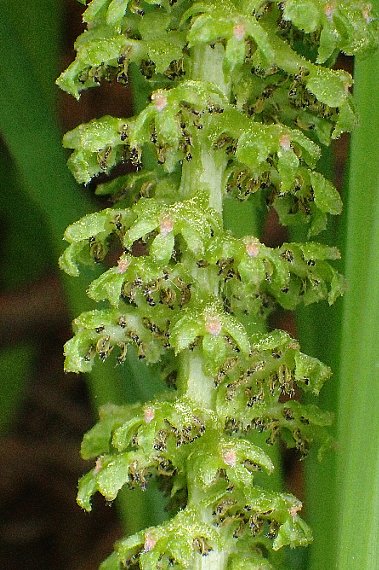 雄花序を一つ落とし、アップを撮らせてもらいました。雌花序は目視では確認できませんでしたが、画像を見るとかろうじて隅に写っていました。