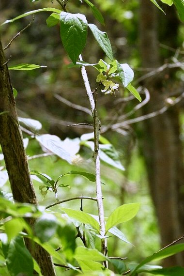 遊歩道沿いで、数人の同好者が枝を長い棒で枝を寄せながら何やら撮影していました。後方の方に何を撮っているのか尋ねたら、違う名を言いましたが、見てみるとオニヒョウタンボクでした。