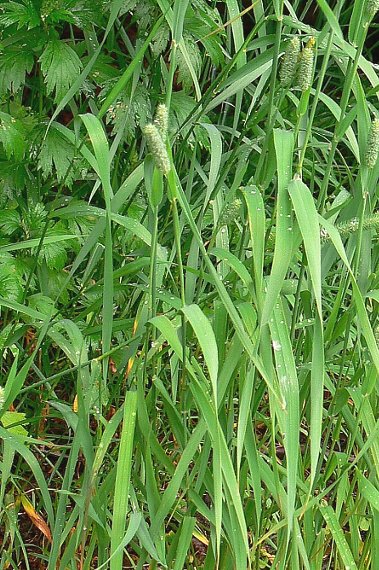 花序は円柱形で直立し、長さ3〜20センチ、淡緑色の小穂を密に多数付ける。小穂は倒卵形で左右に扁平、1小花からなる。苞穎は左右対称で、短い芒がある。花期は5〜8月。