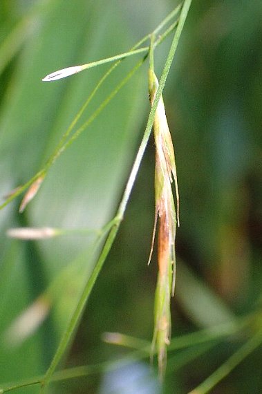 花序は長さ10センチほどの円錐花序になり、小穂を多数付ける。小穂は細く、長さ1〜2センチ、小花が5〜10個付き、小花には長さ4〜6ミリの芒がある。花期は8〜10月。関東地方西部〜東海地方、紀伊半島に分布する。