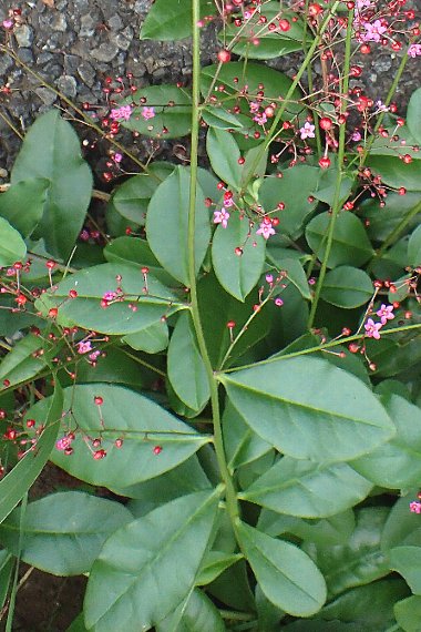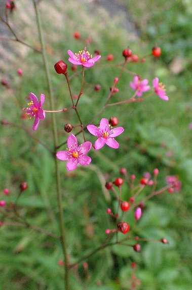 花は茎の上部に大きな円錐花序となって多数付き、花弁は5個、紅紫色で直径6〜7ミリ。花は午後咲き、翌日午前中で萎む。果実(刮ハ)は球形、直径3〜4ミリ、光沢がある。花期は7〜10月。