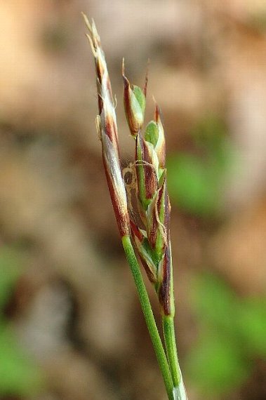 小穂は互いに離れてつき、頂小穂は雄性で太い線形、長さ1〜1.5センチ、側小穂は雌性で2〜5個付き、短い円柱形、長さ1〜2センチ。雌鱗片は紫褐色〜紫紅色を帯び、果胞より長い。柱頭は3岐。果期は4〜5月。北海道〜九州に分布する。
