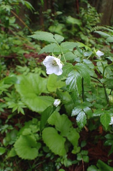 すると、やや細まった林道の草地にこの花らしきものをみつけました。クサイチゴとも違うし、バライチゴの長い葉とも違います。これだ!、と思い、撮影しました。