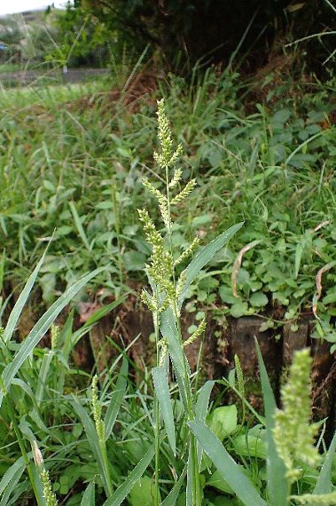 イヌビエの変種。やや乾燥した道端、草地などに生える1年草で、高さは20〜60センチ。全体に小さく、紫色を帯びることが多い。葉は幅5〜10ミリ、葉舌はない。 柄の短い花序枝が疎らに付き、さらに分枝することがないので疎らな花序となる。枝や小穂の基部に数本の長い毛がある。小穂は卵形で長さ2.5〜3ミリ、芒はほとんどなく、第1包類は小さく、鈍三角形。イヌビエと同様に第1小花の護頴は膨らまない。花期は6〜10月。日本全土に分布する。 〜徒然想〜 図鑑等には、イヌビエが湿地などに多いのに対し本種はやや乾いた草地や道端などに生えるとありますが、本画像のものは川と沼地に挟まれた通路に生え、どちらかといえば湿った地であるといえます。乾いた地に限らないということでしょう。 背丈は40〜50センチほどで、膝ぐらいの高さです。花序は小さく、疎らに花序枝が付いています。 本種とイヌビエの違いは全体に小型であることと小穂の形と長さです。 やや枯れて色付いた花序と緑味が残る花序を採取し、小穂の詳細を撮らせてもらい、本種と同定しました。 本種とイヌビエを比較しているうちに、前年に三鷹市の休耕田で撮影したものは本種と思えるようになってきました(当初はヒメイヌビエがあることを知らずイヌビエとしていました)。 −同じ科の植物− |