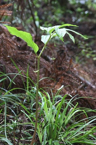 花は葉腋から細い花茎を垂れ下げ、先に黄緑色の小さな花を付ける。花被片は4個で長卵形、同型同大、やや反り返る。葯は橙色で花柱は黒紫色。花期は4〜5月。中国地方、四国、九州(奄美諸島まで)に分布する。
