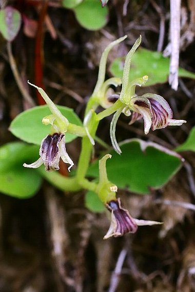 花は茎頂の総状花序に3〜4個付く。苞は卵形で、長さ1.5ミリほど。背萼片と側萼片は披針形、淡黄緑色、長さ4ミリほど。側花弁は糸状で後方に巻き、長さ5ミリほど。唇弁は倒卵形、暗紫色で紫褐色の筋が入り、長さ4ミリほど、先は微細な突起があり、基部はくぼんで、中部から先はやや内巻きになる。蕊柱は内側に湾曲し黄色、葯は卵形。花期は6〜7月。本州(岩手・栃木・山梨・長野県)に分布する。