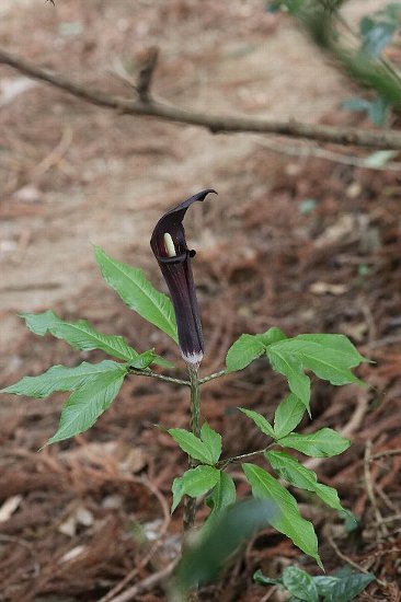 | 山地の林下、林道脇などに生える多年草で、高さは50〜100センチ。葉は通常2個で、9〜17個の小葉を鳥足状に付ける。小葉は狭長楕円形〜楕円形、縁は全縁又は鋸歯があり、表面には光沢がある。 花は葉よりも上につき、仏炎苞は赤紫褐色で外面はときに白粉を帯び、内面には光沢がある。口辺部は開出し、舷部は卵形〜広卵形。中央部が盛り上がり、内面には隆起する細脈がない。付属体は棒状。花期は4〜5月。九州(熊本、宮崎、鹿児島県など) に分布する。 〜徒然想〜 阿蘇付近の道路沿いでいくらでも見られるということでしたが、さすがにまだ早いのでしょう。4月になって急に冷え込み、真冬に戻ったような日が続いていました。 時折り、棒のような芽出しが見られるものの葉や仏炎苞の展開もなく、ヒトヨシテンナンショウとは判断できません。 それでも、歩き回るとみつかるものです。白い棒状の付属体を持った本種がいくつかみつかり、ほっとしました。濃い紫色の仏炎苞と葉の光沢が特徴です。 ただ、調べて見ると仏炎苞は変異の幅があるということで、色だけでは区別できないようです。 付属体についても「日本産テンナンショウ属図鑑」(邑田仁ら,北隆館,2018年)には赤紫褐色とありますが、ネット情報では上部が黄白色、下部が濃紫色とあります。 −同じ科の植物− |