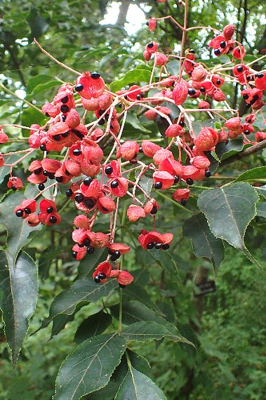 興味は、やはり実になります。光沢のある黒い実と鮮やかすぎる赤い果皮は、遠見でもすぐにみつけられます。しかし、近づくと、どぎつすぎる色合いで、ちょっと身を引いてしまいます。