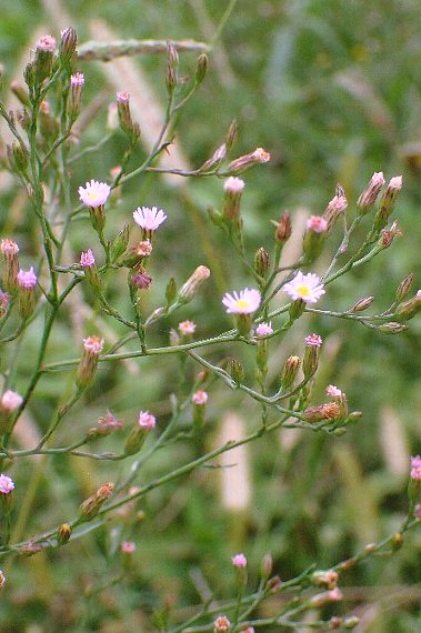 | 花弁はヒメムカシヨモギよりも長く出るように思えます 総苞は無毛、総苞片の先は色付きます | ||