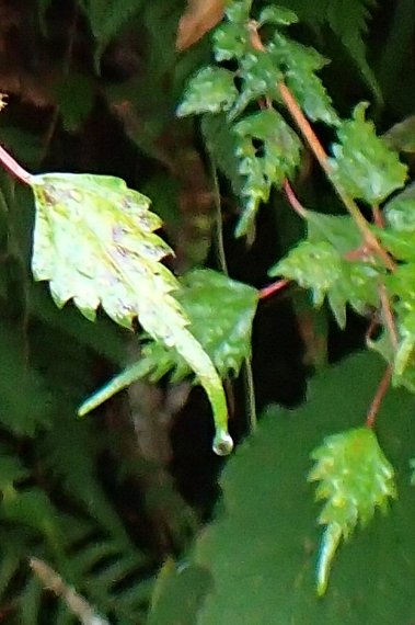 山野の湿った場所などに生える落葉小低木で、高さは1〜2メートル。茎の下部は木質化し、よく分枝する。茎や葉柄は赤みを帯びる。葉は対生し、菱状卵形で、先は尾状に尖るが3裂しない。縁には深い鋸歯がある。