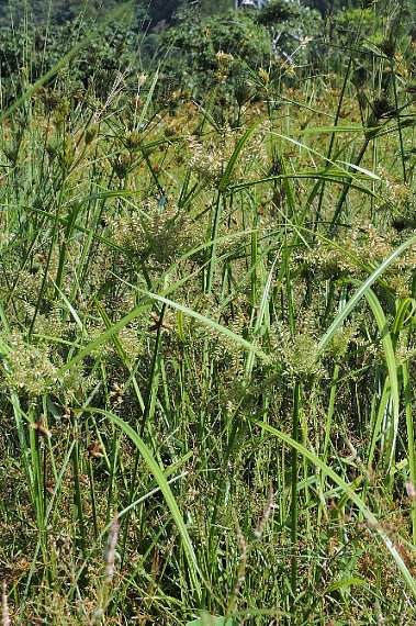 花序は複散房状で5〜10個の分花序がある。分花序は長さ2〜3センチで、円柱形。小穂は花軸に開出して付き、線形、鋭頭。痩果は長さミリほど、狭楕円形。柱頭は3岐する。花期(果実期)は8〜10月。関東地方以西の太平洋岸、四国、九州、沖縄県に分布する。