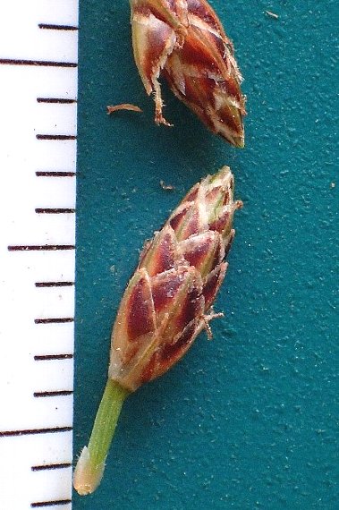 小穂は狭卵形、赤褐色を帯び、光沢がある。鱗片は卵円形、無毛で鈍頭。果実(痩果)は広卵形でレンズ形、長さ0.8〜1.2ミリ、隆起する格子紋がある。果(花)期は8〜9月。千葉県以南〜沖縄県に分布する。