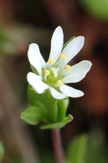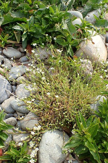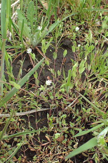 山野の道端、草地、河川敷などに生える1〜2年草で、高さは5〜30センチ。茎は株状になり枝を分け、下部は地を這い、上部は斜上する。葉は柄がなく、長楕円形で、先が尖る。 花は集散花序となり数個付き、白色で直径6ミリほど。花弁は5枚で、基部近くまで2深裂し、萼片より長い。茎、葉、萼片は無毛。花柱は短く3裂する。花期は4〜10月。日本全土に分布する。 〜徒然想〜 多摩川河川敷は身近な植物の観察地で、ふらっと花散歩することがたびたびです。 ノミノツヅリ、コハコベ、ミドリハコベ、ウシハコベなどハコベの仲間も多いですが、いつでも見られるという意識から、あまり撮影はしていませんでした。 ノミノフスマは全草毛がなく、葉は長楕円形で、茎に対して鋭角的に立ち上がります。花弁が萼片より長い点も特徴です。 花弁が萼片より短いノミノコブスマが報告されていますので、今度探してみることにします。 −同じ科の植物−
