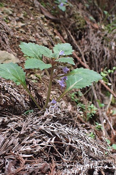 花は淡紫色で、キランソウより薄くジュウニヒトエよりは濃い。花期は4〜5月。本州、四国に分布する。