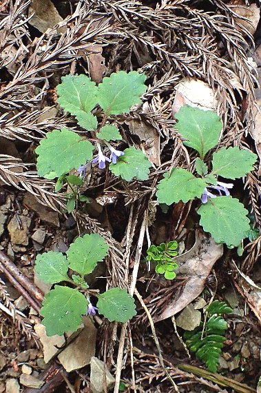 近年になってジュウニキランソウの名を知り、交雑の一形態と思いました。茎は立ち上がり、背丈は15〜20センチほど、葉は対生していました。花は葉腋に2〜5個ずつ付いているようで、キランソウより薄く淡紫色です。