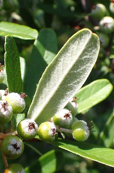 本種、カザンデマリ、トキワサンザシを総称してピラカンサと呼ばれますが、本種は葉の幅が細いこと、葉裏や萼などに白い綿毛が密生すること、果実は黄色味があることなどが特徴です。