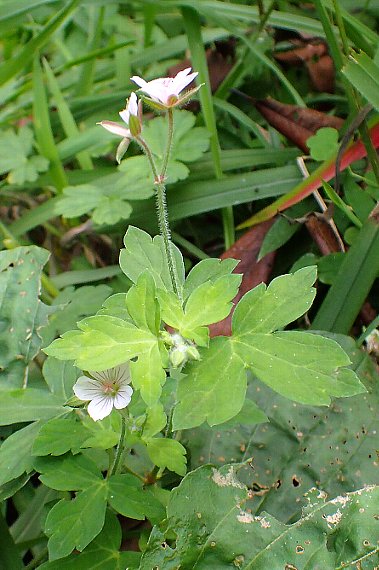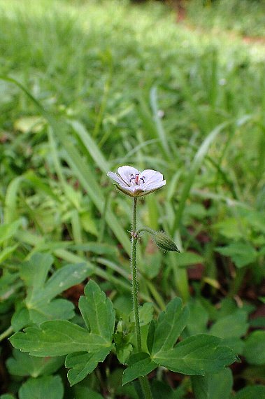 他の花も探しながら登り、フウロソウの仲間なら多分この辺りが候補の一つと、すこし丁寧に探します。すると大正解! ぽつりぽつりとフウロソウが見えます。数は多くはありません。