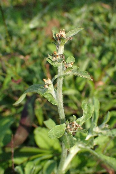北米原産の帰化植物。道端、荒地、河川敷などに生える2年草で、高さは15〜40センチ。茎は基部で分枝するか1本立ちし、茎や葉全体が綿毛に覆われ白っぽく見える。葉はへら形で、先は円頭、縁は全縁でやや波打つ。