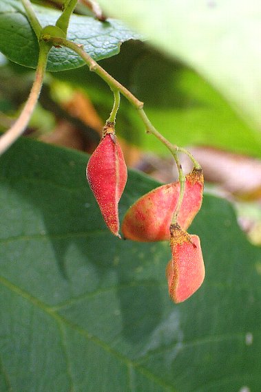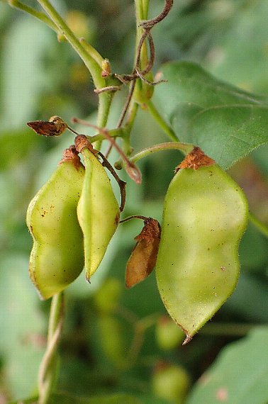 | 豆果は扁平な楕円形で、熟すと赤くなり、種子は黒くなります 種子はふつう2個ですが、1個もあります | ||