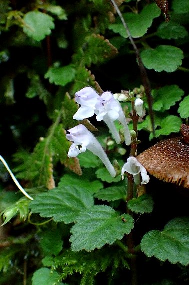 コケの中に小さなタツナミソウの仲間が見えました。ヤクシマシソバタツナミソウでしょう。予想しつつも、期待していなかった花です。