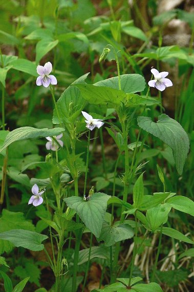 山地の林縁、草地などに生える多年草で、高さは20〜40センチ。葉は卵形〜心形で、上部のものほど大きく、基部は浅い心形。