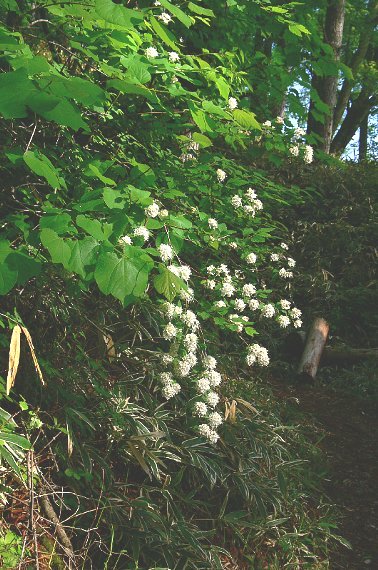 山地の日当たりのよいところに生える落葉低木で、高さは1.5メートルほどになる。葉は卵形〜狭卵形で、先端は尖り、縁には基部を除いて欠刻状の重鋸歯がある。葉の両面に軟毛がある。 枝先に直径3センチほどの散房花序に多数の花を付ける。花は白色で5弁、雄しべは約40個と多い。花期は5〜6月。北海道、本州中部地方以北、九州(熊本県)に分布する。 〜徒然想〜 アイズシモツケで思い出すのは、このHPを開設してまもなく、アイヅシモツケとしてアップしたものがコアジサイの間違いで、それをKさんに指摘して頂いたことです。 今から思えば、間違えようもない両者なのに、何をどう勘違いしたのか、お恥ずかしい記憶です。でもそのお陰で、Kさんとはお付き合いさせて頂いて、花観察にもご一緒しています。 このアイヅシモツケを撮影したときも一緒のときで、想えば、奇縁だったかもしれません。 長野県での画像を追加しました。 −同じ科の植物− |