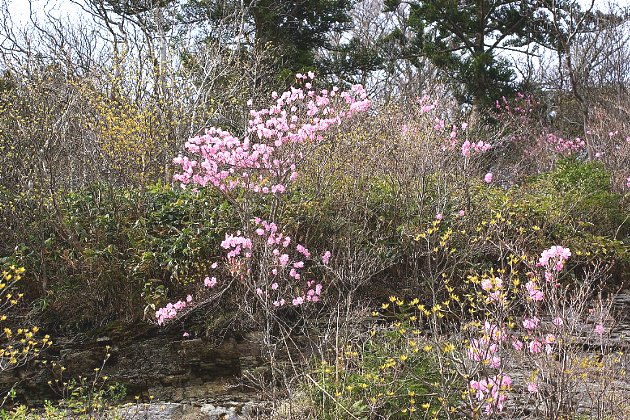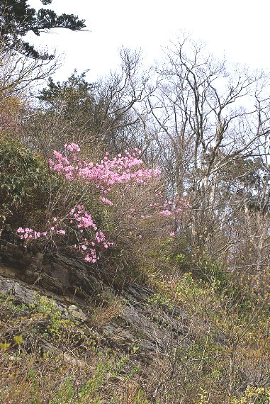 | 近畿地方以西、四国、九州の深山に生える落葉低木で、高さは3〜5メートル。枝分かれがよく、輪生状に5枚の葉を付け、葉よりも先に淡紅色の花を付ける。花期は4〜5月。 〜徒然想〜 アケボノツツジの名は、地元の愛好家の方に教えてもらいました。指差す山の山頂に、淡いピンクの木が見えます。 残念ながら、山頂までは片道30分余りかかるとのことで、時間のない旅人は断念です。 車道からもいくつかみられ山を彩っていますが、いずれも距離があり、花のアップは撮れませんでした。 夜明けのあけぼの色にたとえて名前が付けられたとか、ほんとに赤みの少ないいい色具合です。 遠見でも、花は丸みがあり、柔らかな感じが分かります。 −同じ科の植物− |